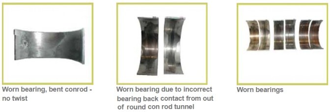 Close examination of bearing wear patterns will indicates what component is at fault. Eg. An offset wear pattern on the upper and lower shells would indicate a bent con-rod as the cause. Fine lines and scratches the length of the bearings indicate the introduction of abrasive material. Worn high spots on the bearing face and corresponding marks on the back indicate dirty assembly. Insufficient crush is evident by the polished areas on the back of the bearing.